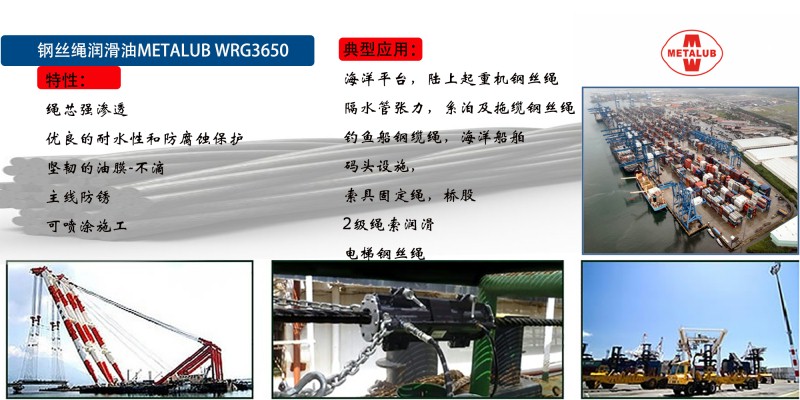 钢丝绳润滑油WRG3650是专门为钢丝绳,滑轮和转鼓提供最大的保护而制定,同时保持极高的性价比润滑油。钢丝绳润滑油WRG3650是特别定制,含有特殊的化学极压成分,防锈和腐蚀抑制剂具有优良的耐水,水置换特性。钢丝绳润滑油WRG3650是环保型润滑油,设计用来替代废油。其抗磨损和耐腐蚀性能为钢丝绳内部和外部的全年使用,为钢丝绳提供完全保护。拒水性确保任何渗入钢丝绳芯的水都将被置换排出。钢丝绳润滑油WRG3650是一个渗透润滑剂,可为钢丝绳,滑轮提供最大的保护,同时保持极高的成本效益。